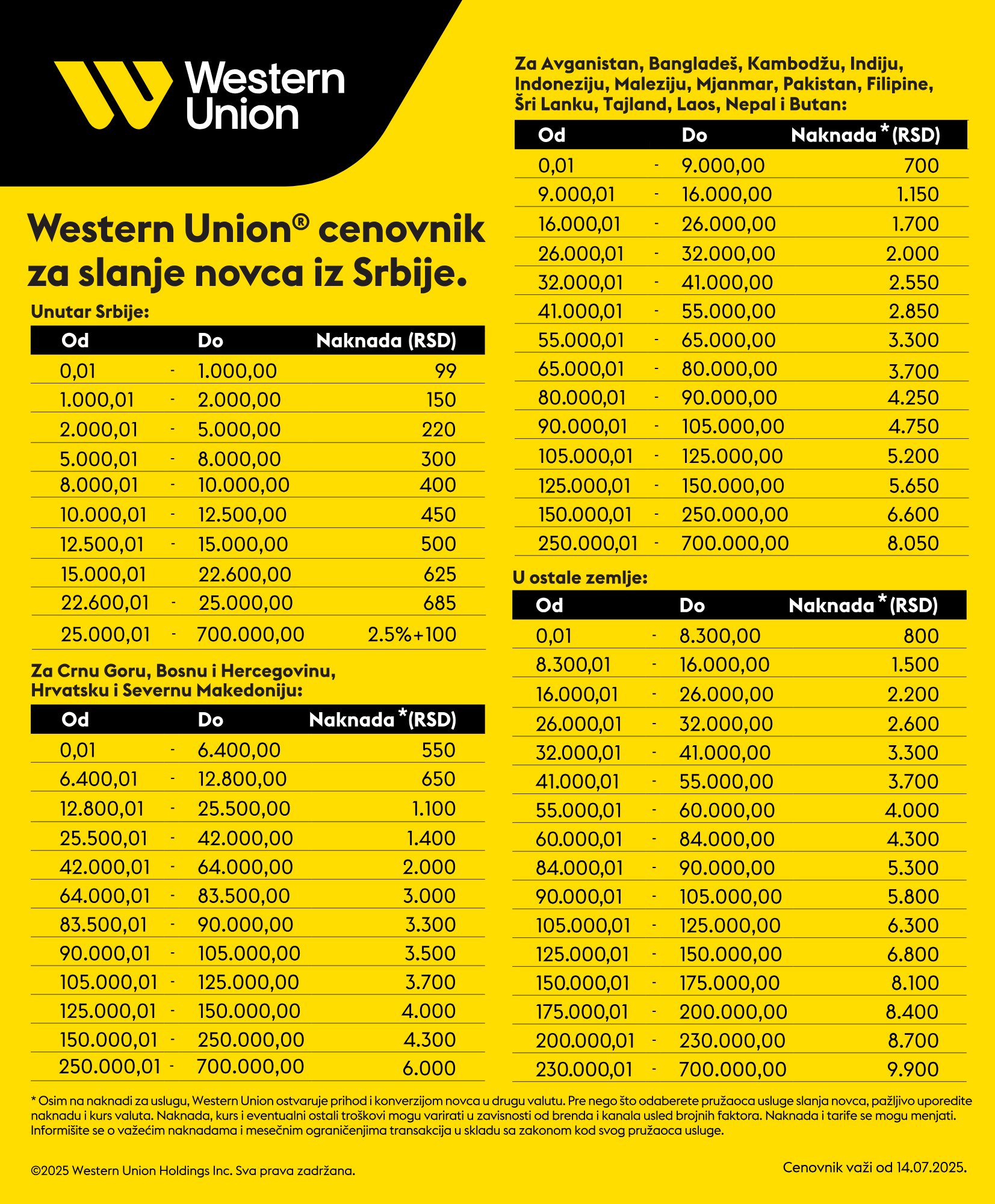 • proviziju za transfer novca uvek plaća samo pošiljalac, prilikom prijema novca ne plaćate ništa